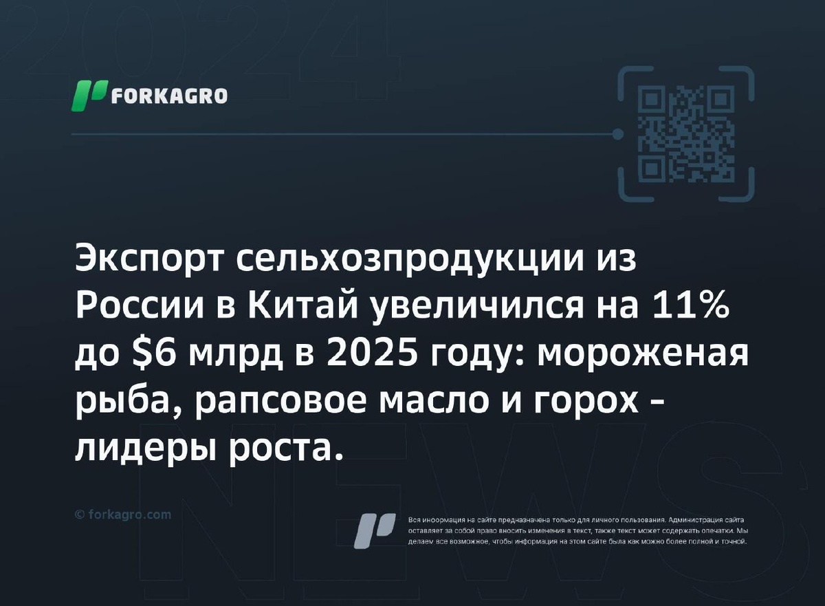 Экспорт сельхозпродукции из России в Китай увеличился на 11% до $6 млрд в 2025 году: мороженая рыба, рапсовое масло и горох - лидеры роста