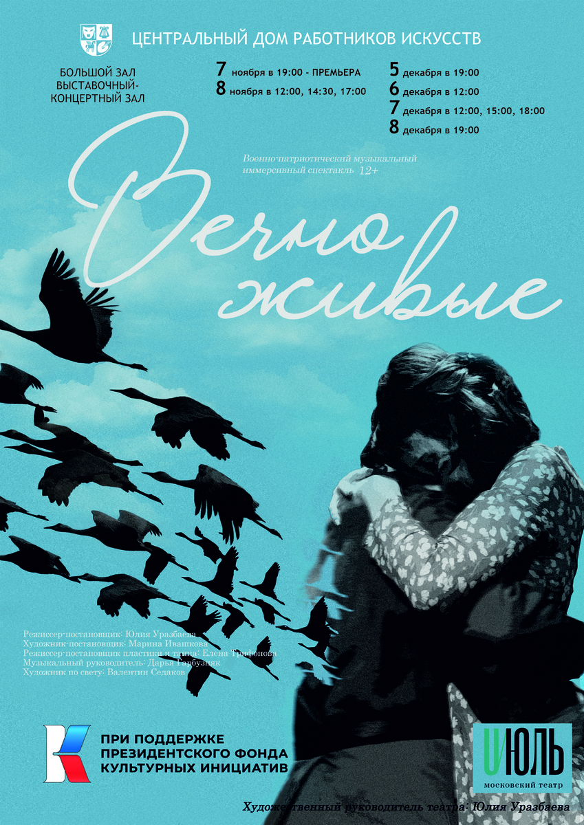 Премьера состоялась! 7 ноября в залах ЦДРИ прошёл первый показ музыкального военно-патриотического иммерсивного спектакля "Вечно живые", при поддержке Президентского фонда культурных инициатив! Это был особенный вечер — наполненный эмоциями, искренностью и теплом зрительских сердец. История о войне, история о вечной любви, история, которая не знает времени и продолжает жить, несмотря ни на что - нашла отклик в каждом, кто был в зале. Мы благодарим всех, кто разделил с нами этот важный момент. И — рады сообщить! — впереди ещё показы, и у вас есть возможность присоединиться к нам и пережить эту историю вместе. Сегодня 8.11 в 12:00, 14:30, 17:00 — регистрация доступна по ссылке: