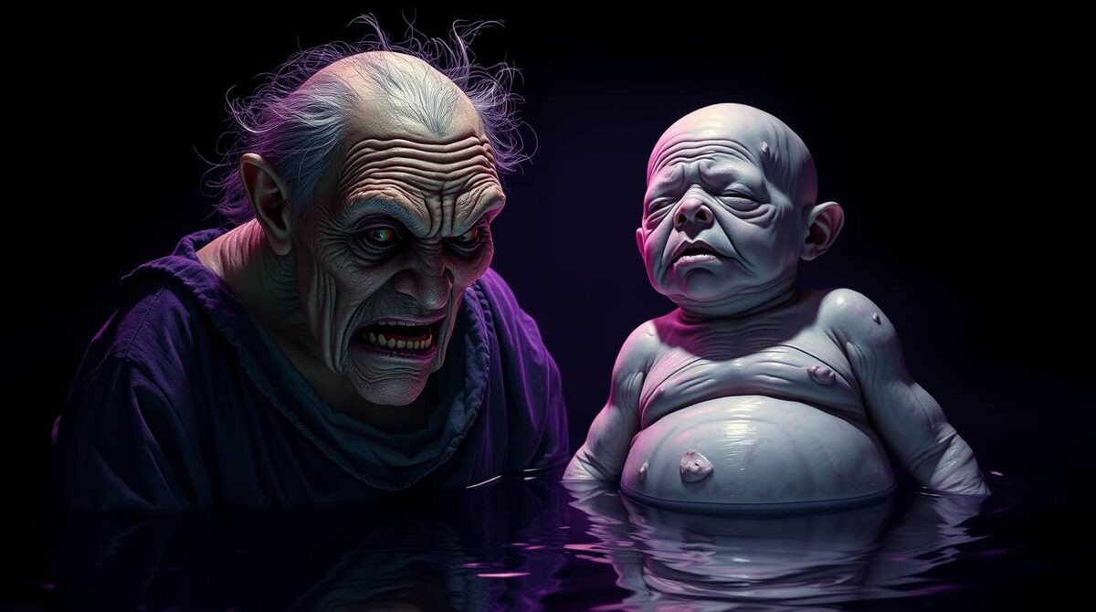 — Но мы-то были сытые и отдохнувшие. И потому маскировка с неё начала опадать. Знаешь, как дешёвый спецэффект. С виду — обычная старуха, но начинаешь приглядываться к деталям… и кровь в жилах стынет. Руки у неё… плечевые кости были неестественно короткими, отчего локти находились почти у самых подмышек. Она держала кисти сложенными на животе, и если не знать, куда смотреть, никогда не заметишь. Но стоило ей чуть шевельнуться, и становилось видно — пропорции аномальные. А глаза… Видел, когда человек умирает с открытыми глазами? Взгляд стекленеет, он будто смотрит в никуда. Вот у неё был такой же взгляд. Мёртвый! Зрачки не двигались, не фокусировались. Просто два мутных серых кругляша, вставленных в глазницы. Полная декорация.