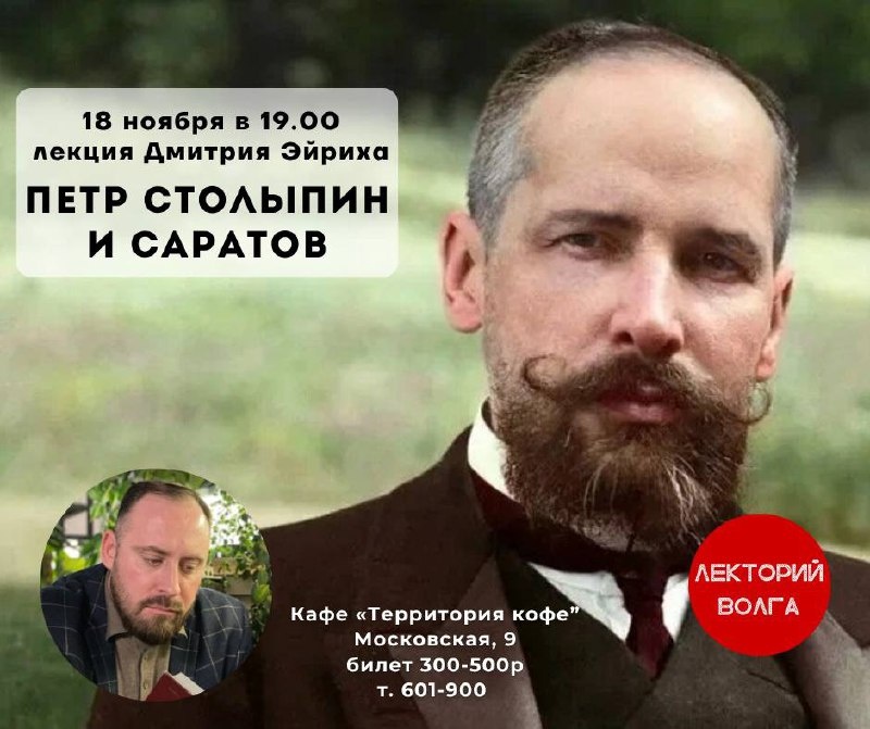 Лекторий «Волга» приглашает на лекцию Дмитрия Эйриха 18 ноября в 19.00 «ПЕТР СТОЛЫПИН И САРАТОВ» Петр Аркадьевич Столыпин - известный государственный деятель Российской империи, великий реформатор. Будучи губернатором проявил свой управленческий талант и создал основу для будущих грандиозных преобразований. О холодном уме и таланте Столыпина слагали легенды. На Столыпина было 11 покушений. Его неоднократно пытались убить ещё на должности губернатора. Зачастую от смерти Петра Аркадьевича спасало лишь хладнокровие и знание человеческой психологии. Однажды в толпе один из мятежников в упор направил на Столыпина револьвер. Безоружный губернатор подставил пуле грудь и решительно сказал: «Стреляй!» Неудавшийся убийца не выдержал и бросил оружие. На лекции вы узнаете: ✅ Как реформы губернатора повлияли на экономику региона ✅ Как великий реформатор противодействовал революционному движению ✅ Каким характером обладал политик и какой управленческий стиль он использовал ✅ Какую работу о