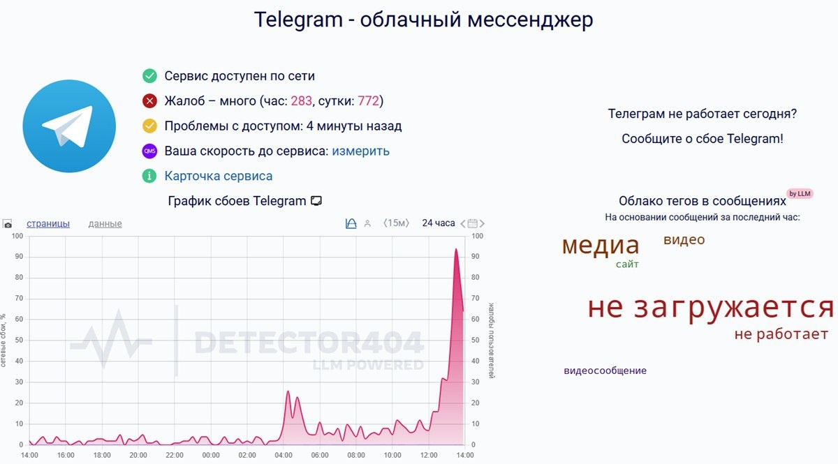 Сибиряки жалуются на сбой в Telegram Всплеск жалоб на работу мессенджера Telegram отмечен в России. По данным сервиса Downdetector, за час пришло более 280 жалоб, в основном на загрузку медиа. Из Сибири сообщения о проблемах приходят в частности из Новосибирской области. О трудностях с загрузкой видео в мессенджере говорят наши подписчики, пользующиеся услугами «Билайн» и «Ростелекома». О том, что пользователи не могут скачать медиа и слушать голосовые сообщения, пишет канал «Новосибирск с огоньком». Помимо Новосибирска из регионов за Уралом жалобы приходят из Приморья и Магаданской области, следует из данных Downdetector. Подписаться| Прислать новость| Помочь бустами