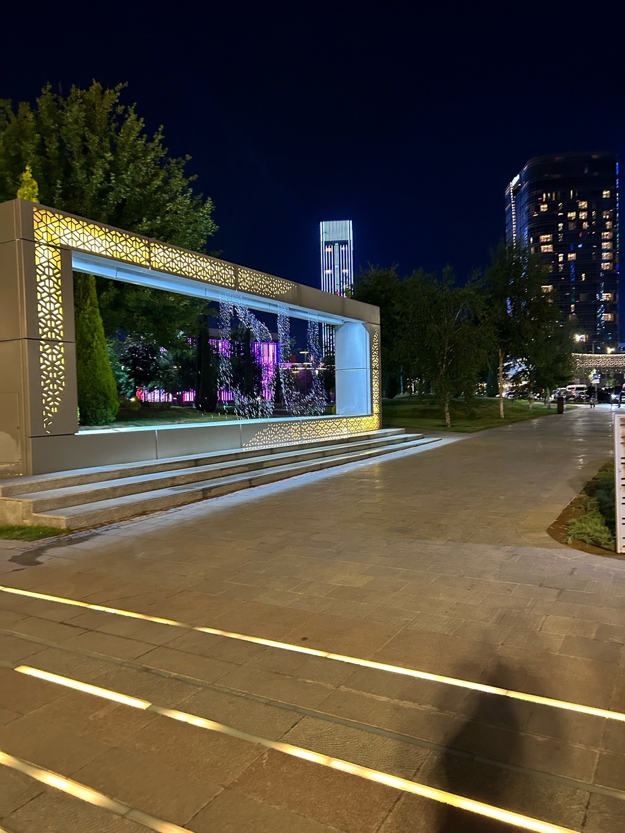 Ташкент сити парк с темнотой становится точкой притяжения - как туристов, так и местных. Вокруг припарковано множество автомобилей, люди разных возрастов гуляют, веселятся, сидят на траве, едят мороженое... Есть детские площадки, прикольные кафешки. Но ярчайшая достопримечательность Ташкент Сити Парка - это танцующий фонтан. Он расположен в искусственном водоеме, площадь которого около 15 га. Длина самого фонтана аж 200 метров, а вверх он может выстрелить на 80 метров (в Сочи, кстати, на 50 метров!) От сильного ветра струи воды из фонтана сдувает на людей. Из парка можно выйти хорошо промокшим) А в 20 минутах пешком от Сити Парка есть еще один парк - Magic City, местный Диснейленд. Вот такая сторона Ташкента - стильная-современная. Magic city - это тематический парк с поющим фонтаном, кафешками, музеями и аттракционами. Даже несмотря на дождь тут красиво) Парк открыли в 2021 в рамках реконструкции национального парка. Конечно же, в центре «узбекского Диснейленда» стоит копия замка Нойш