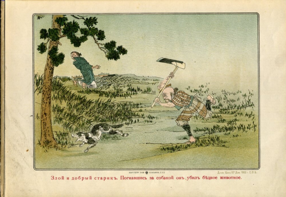Эту сказку мы прочитали в книге «Японские народные сказки» 1902 года издания, которую нашли в Питерском букинистическом магазине в 2018 году. «Сказка о добром и злом стариках» принесла немало открытий. Дело в том, что эту сказку все любители японского фольклора знают давно, она переводилась и издавалась на русском языке много раз и известна под такими названиями, как «Дед Ханасака» и «Груша вверх! Груша вниз!», а также «Добрый и жадный». Переводили и пересказывали ее В. Мендрин, В. Маркова, Б. Бейко, Н. Ходза. То есть сейчас мы нашли как минимум пять вариантов перевода этой сказки, которые в деталях и в сюжете отличаются друг от друга. Основная линия неизменна: это история двух соседей, один из которых добрый, а другой злой и жадный, а также волшебные превращения щенка или собаки, которую убил отрицательный персонаж.