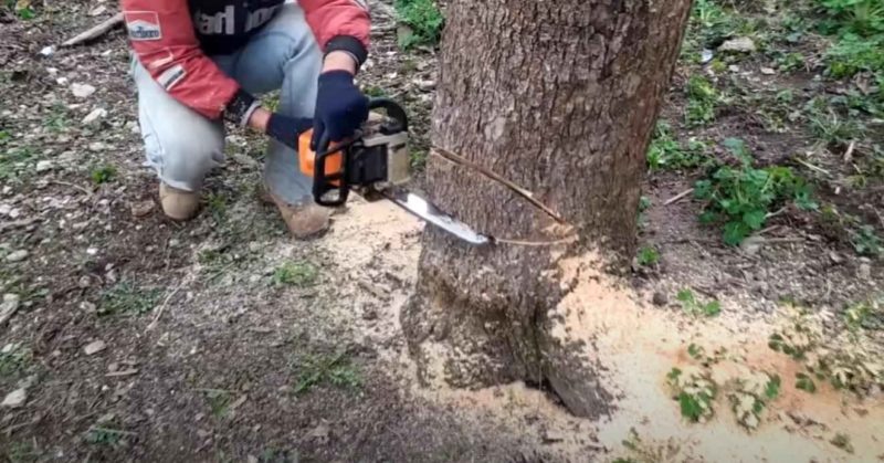Спилить дерево бензопилой — дело вроде бы нехитрое. При условии, что вы знаете, как правильно это сделать. А вот если пилить наобум, то можно и «дров наломать». А оно вам надо? 👉 В этой статье мы расскажем, как правильно спилить большое дерево бензопилой, чтобы все прошло «без сучка и без задоринки». Ну то есть, чтобы вы и дерево спилили, и свой/соседский дом с линиями электропередач при этом не пострадали. Первым делом нужно будет определиться, в какую именно сторону валить дерево. Да, это очень важно, потому что, если не продумать этот момент, то последствия ваших действий могут быть непредсказуемыми. Итак, в этом месте не должно быть жилых и хозяйственных построек, а также забора и опор ЛЭП. 👉 Ну и самое главное — там не должно быть людей. После этого с одной стороны ствола (которая смотрит на то место, куда должно упасть дерево) нужно будет сделать два надпила: один горизонтальный, второй — под углом сверху. Вырезаем клин. Половина дела уже сделана. Теперь остается самый прос