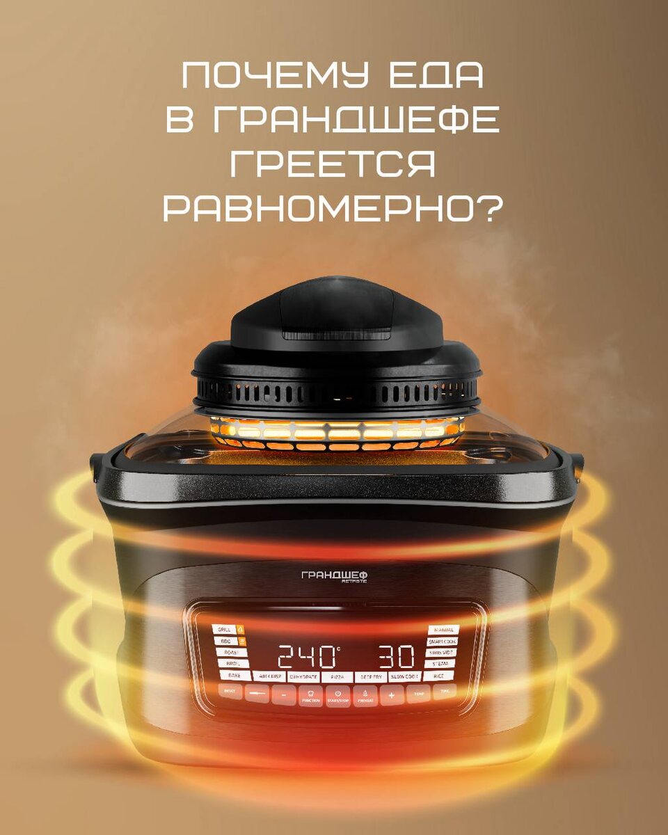 Когда разогреваешь блюдо в микроволновке – снаружи горячо, а внутри всё ещё холодно. Духовка справляется лучше, но тоже не идеальна: разогревается долго, сушит еду и требует постоянного присмотра. Грандшеф изначально создавался так, чтобы готовить и разогревать быстро, равномерно и без потери сочности. Наше главное преимущество – два ТЭНа, нанокерамическое покрытие и конвекция 360°: Умная система контроля Грандшефа сама отслеживает температуру и время. Благодаря чему блюда готовятся почти в 2 раза быстрее, чем в духовке, а выпечка получается румяной снаружи и воздушной внутри. Присоединяйтесь к сообществу ГРАНДШЕФнутых в Телеграм. У вас еще нет ГРАНДШЕФА? Откройте для себя мир готовки с наслаждением: 👉Купить на WB