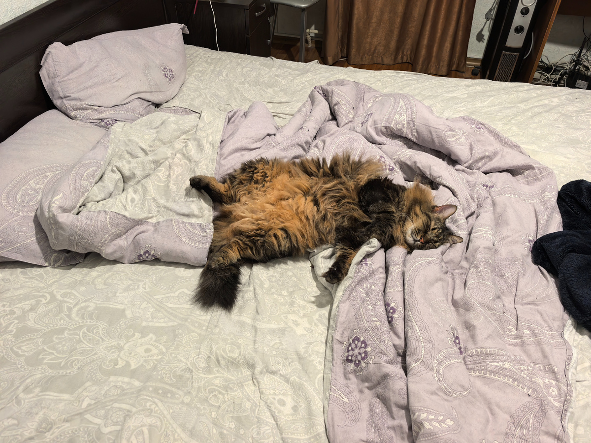 Всем привет! С вами Кузя Кусалочкин (он же царь Кузьма I). Сегодня расскажу, какой сюрприз устроил хозяевам и чем они занимались в 12 ночи. Утро прошло стандартно. Встали мы с хозяйкой, я получил свой паштетик. А потом ещё и сливочки попил. На новые каналы я сейчас не подписываюсь. Дружить, забежать в гости времени нет. Хозяин не застелил постель. Хозяйка это не любит, а я обожаю! Сделал там себе гнездо и спал: Хозяйка периодически заходила в комнату, а я всё позы менял. Голову надо всегда в тепле держать! В обед хозяйка куда-то собралась. Оказалось, что в магазин. Встретил я её вот так: Сумку особо не проверял, понял, что там вкусности купили. Хозяйка взяла курочку целую и разные запчасти. Ну и, как всегда, немного ерунды взяла в виде ватных палочек, замороженных ягодок и творожных сырков. Ах да. Хозяйка думала, что уйдёт, а я буду спать, и не оставила мне еды. Но я ей там напомнил. Загрёб коврик в ванной. Сссанкции не делал, но предупредил. Я же: Поэтому хозяйка мне сразу же решила
