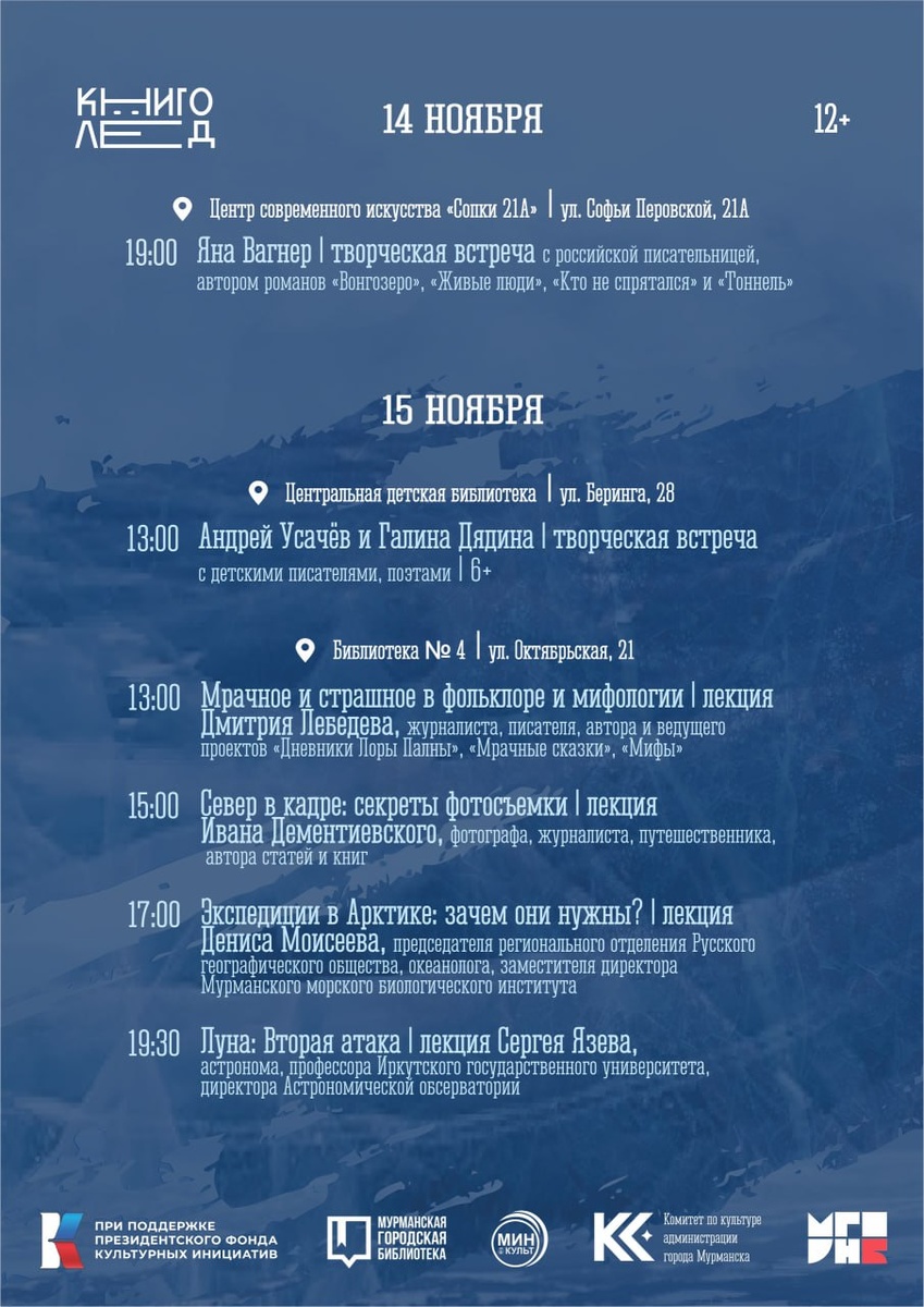 💙 Встречайте программу фестиваля «КнигоЛед» 2025! В этом году фестиваль пройдет с 14 по 16 ноября на десяти площадках – областной, городских и детских библиотеках Мурманска. 👉 Гостями фестиваля «КнигоЛёд» станут писательницы Яна Вагнер, Ася Лавринович, Надя Алексеева, астроном, директор Астрономической обсерватории Иркутского госуниверситета Сергей Язев, популяризаторы науки Антон Нелихов и Никита Самохин, журналист, писатель Дмитрий Лебедев, автор триллеров Константин Образцов, а также путешественники, фотографы, авторы и иллюстраторы детских книг. Специальным гостем самой большой площадки семейного чтения станет детский писатель, поэт и драматург Андрей Усачев. Целая команда комиксистов приедет в Мурманск специально для встречи с нашими читателями. 🔥 Количество мест ограничено! Запись на творческие встречи и мастер-классы скоро откроется, следите за новостями в группе фестиваля. #КнигоЛёд_2025