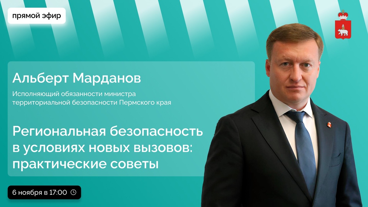 Альберт Марданов, исполняющий обязанности министра территориальной безопасности, ответит на актуальные вопросы безопасности в Пермском крае