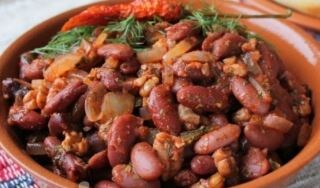 Ингредиенты: - 500 г фасоли - 5 луковиц - 500 г помидоров - 2 ст. л. топленого масла - 1 ст. л. измельченной зелени петрушки - 1 ст. л. измельченного укропа - 1 ст. л. измельченного базилика - 1 ст. л. измельченной кинзы Приготовление: Перед приготовлением блюда на несколько часов замочить фасоль в воде (2-3 раза воду сменить). Затем отварить фасоль (она не должна сохранить форму). На топленом масле потушить мелко порезанный лук. Снять кожицу с помидоров, размять их, смешать с жареным луком, выложить в сотейник с фасолью и тушить, пока масса не загустеет. За 5 минут до готовности добавить мелко порезанную зелень и посолить.