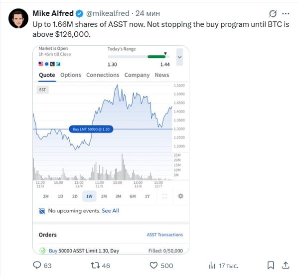 Уже купил до 1,66 млн акций ASST. Не остановлю программу покупок, пока BTC не превысит $126 000.