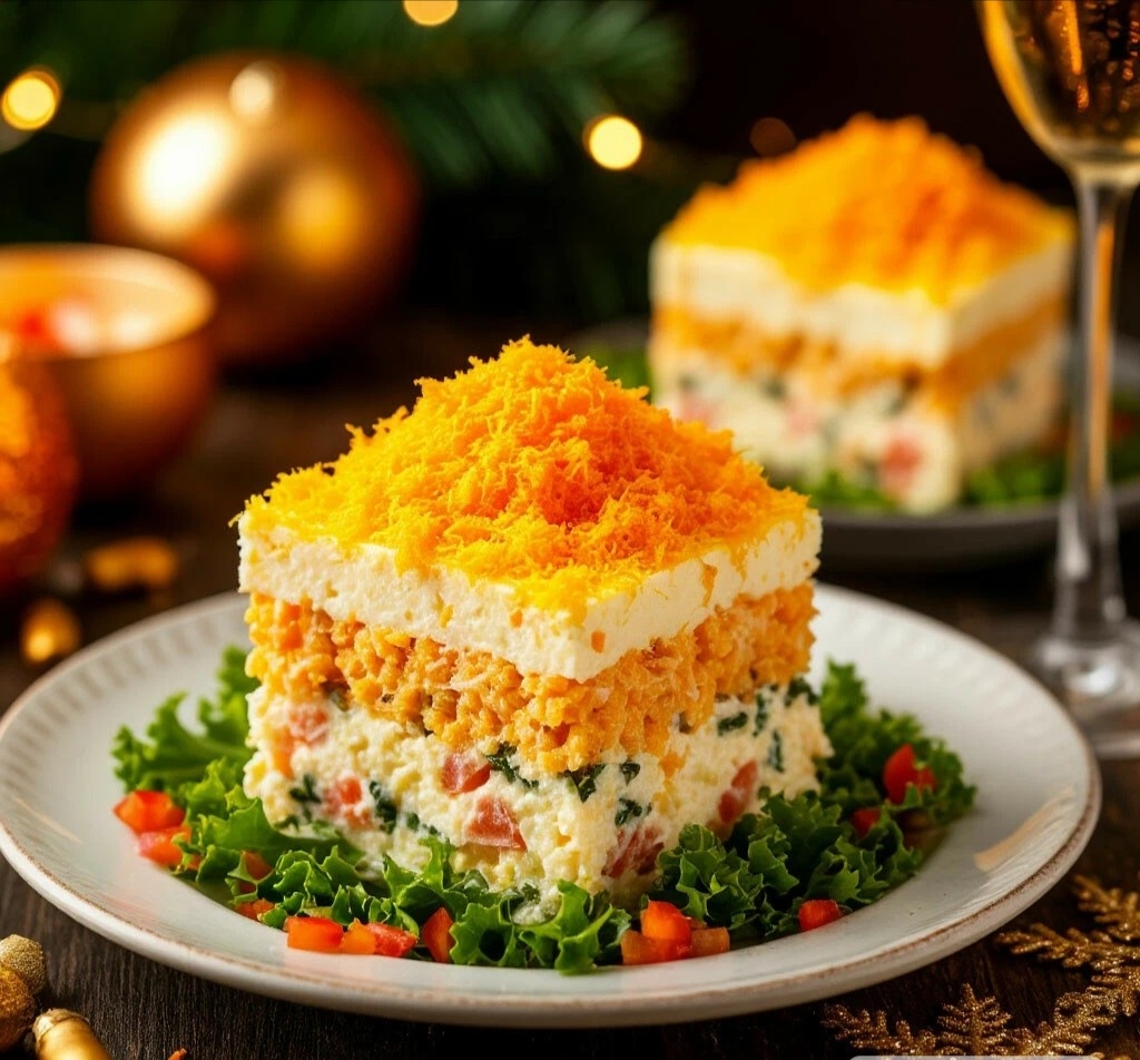 САЛАТ — МИМОЗА ИЗ ЛОСОСЯ ГОРЯЧЕГО КОПЧЕНИЯ Мяу, мои пушистые ценители изысканных салатов! 😺 Приготовим обновленную классику — мимозу, но не простую, а с лососем горячего копчения! Этот салат станет настоящим украшением новогоднего стола! 🌟 МИМОЗА ИЗ ЛОСОСЯ ГОРЯЧЕГО КОПЧЕНИЯ ИНГРЕДИЕНТЫ: 🧾 ·Лосось горячего копчения — 300 г ·Филе анчоусов — 50 г (мелко порубить) ·Яйца — 5 шт. ·Сыр Чеддер — 150 г (натереть) ·Морковь — 1 шт. (150 г, отварить, натереть на мелкой терке) ·Яблоко — 1 шт. (очистить, натереть на средней терке) ·Лук красный — 1 шт. (мелко нарезать, обдать кипятком) ·Сливочное масло — 100 г (размягченное) ·Майонез — 150 г ·Укроп — пучок (мелко порубить) ·Соль — по вкусу ВРЕМЯ ПРИГОТОВЛЕНИЯ: ⏰ 40 минут + охлаждение СЛОЖНОСТЬ:🐾 Нужна сноровка ПОШАГОВЫЙ РЕЦЕПТ: 👩🍳 1. Яйца отварить вкрутую, охладить, очистить. Белки натереть на средней терке, желтки — на мелкой. 🥚 2. Сборка салата слоями: · Первый слой: Белки + майонез · Второй слой: Лук · Третий слой: Лосось + анчоусы · Ч
