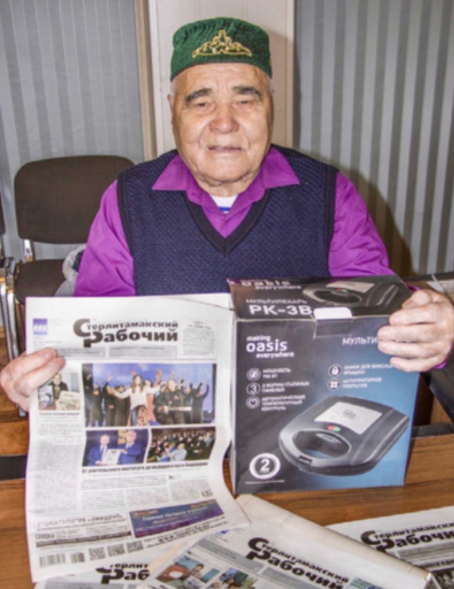 Пришёл наш верный 87-летний подписчик! Наш преданный подписчик Ахсан Рабульвалеевич Якупов, выигравший приз газеты, несмотря на солидный возраст (ему 87 лет) пришёл в редакцию пешком. Живёт он недалеко от автовокзала. То есть прогулялся по всей улице Худайбердина. А после вручения приза, тоже пешком, отправился в мечеть на пятничный намаз. Родился и вырос Ахсан Рабульвалеевич в Гафурийском районе. С 1938 по 1944 год воспитывался у дедушки.Так как отец участвовал сначала в войне с финнами, потом в Великой Отечественной. Хорошо помнит, как привезли его домой раненого, всего в бинтах. Помнит делушку, говорившего что он ровесник Ленина, и бабушку, прожившую 109 лет.
