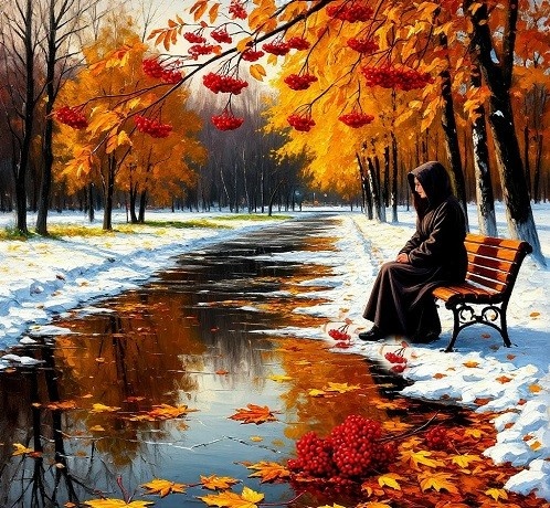 Капля – раз, капля – два, капля – три… «Осень, ритм дождя, ещё раз повтори!» Капля бьёт по хрупкой кромке льда, Хрустнул лёд – кульминация пошла! Зарядил сильнее барабанной дробью дождь. С ветки сыплется рябины гроздь, Красным пламенем растекается по льду, «Яркая картинка, где ещё такое я найду…» Лужа снежная с узорчатой каймой, Отголосок осени сливается с зимой. Осень песню дарит, каплями играет дождь. «Дай, зима, дослушать! В своё время к нам придёшь! Запоёшь ты вьюгой и метелью снежной, Знаю твой мотив холодный, «нежный». От твоих морозных песен щёчки розовеют, И ресницы от напева леденящего белеют». Капля – раз, капля – два, капля – три… «Осень, ритм дождя, ещё раз повтори!» Начинает дождь играть второй куплет, Тянется волной от капли след. Чуть касается вода осколков льда, Тает лёд, и струйка исчезает в никуда. Меньше льда и больше лужа, Так приятно осень слушать! «Что же, осень, завершающий куплет? Будет он, конечно, ноябрём нам спет. Жёлтых листьев танец к песне он добавит, Звук