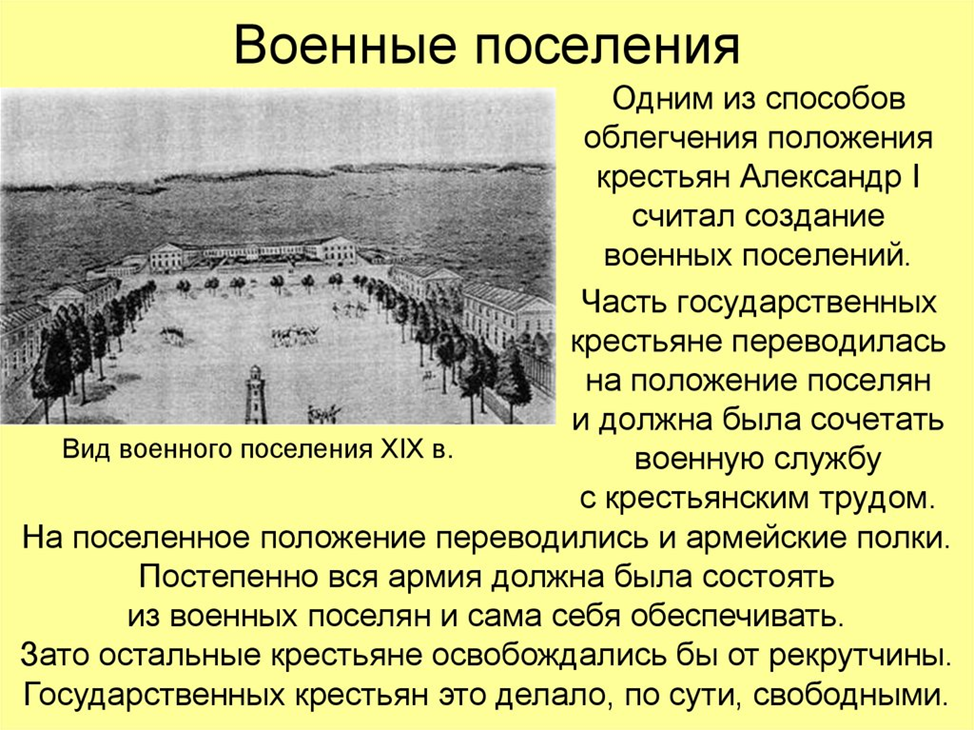1. России требовалось содержать большую армию, но денег не было. Страна была истощена войной и деньги требовались для восстановления промышленности и городов. Поэтому предполагалось, что поселения смогут в кротчайшие сроки стать самоокупаемыми.
