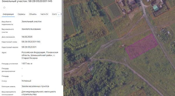 Название: Земельный участок из земель населенных пунктов с кадастровым номером 58:28:0520301:145, общей площадью 1877 кв.м., с видом