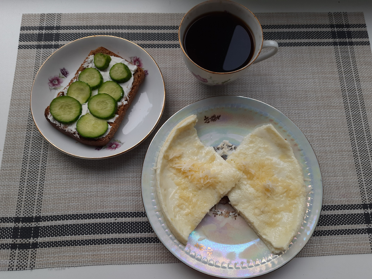 В субботу на завтрак сварила овсяную кашу. Ну и дежурные бутерброды с творожным сыром, огурцом и пармезаном.