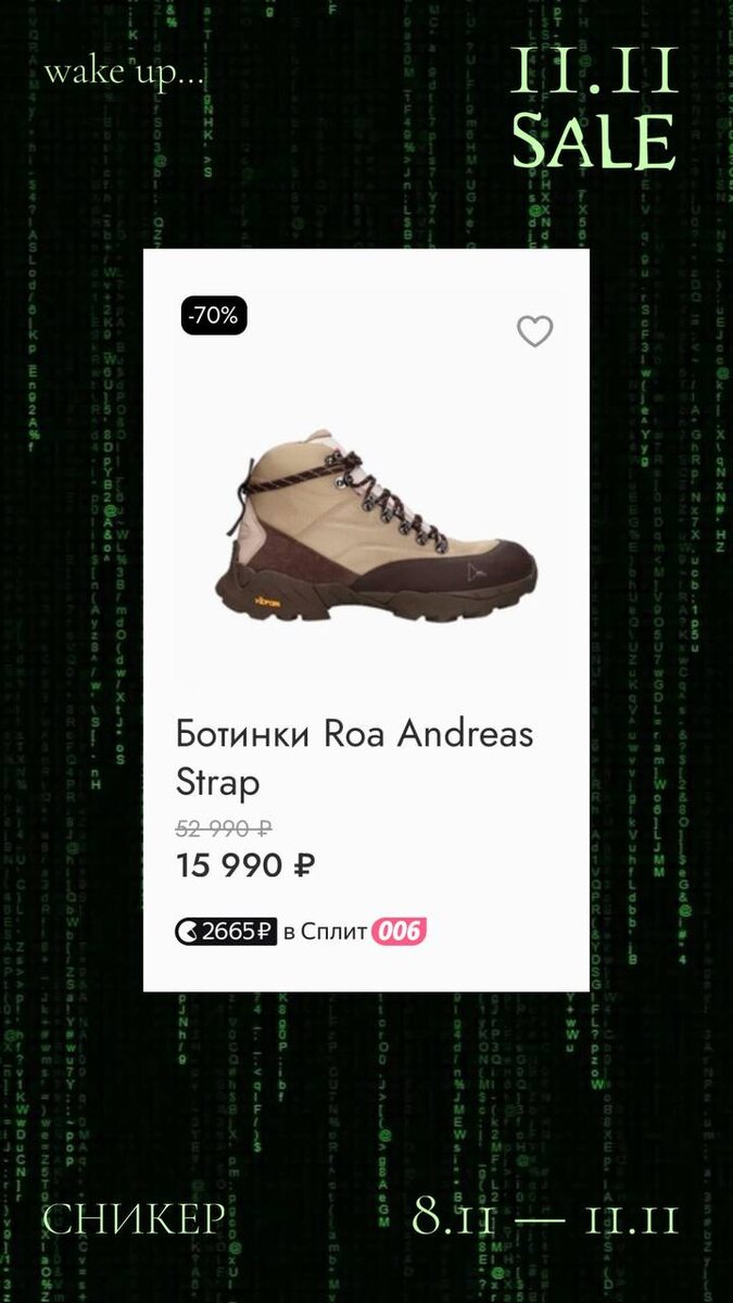 11.11 SALE С 8 по 11 ноября в магазине и на сайте THESNEAKER.RU действуют скидки: — 15% на всю новую коллекцию — 70% на прошлые коллекции Шикарная возможность утеплиться перед сезоном и приобрести лучшее из селекции Premiata, Timberland, OBEY, HIKES, Red September, Puma, Camper, Aries, Два Мяча, Camperlab, ICECREAM, NCF, Dr. Martens, HOKA и др. На сайте действует промокод «matrix» со скидкой -15% на все товары по фулпрайсу💿