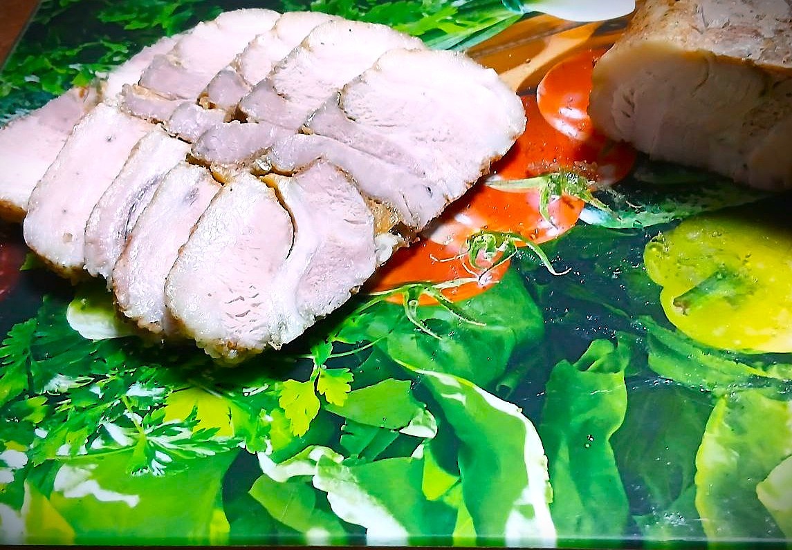 Домашняя варёно-копчёная грудинка без кожи — тёмная, сочная и пряная, такая, что вы забудете про магазинную колбасу. Сочетание плотной текстуры и насыщенного вкуса, получаемого от тщательного втирания соли и ароматных специй, делает её отличной как холодная закуска, нарезка для бутербродов или дополнение к гарнирам. Ингредиенты: ⦁ Свиная грудинка без кожи — 1–1,5 кг ⦁ Соль — достаточное количество для втирания (ориентировочно 2–3 столовые ложки) ⦁ Специи по вкусу: орегано, сушёный имбирь в порошке, сушёный чеснок (порошок), копчёная паприка (можно и другие — кориандр, чёрный перец, тмин) ⦁ Пищевая плёнка — несколько слоёв ⦁ Вода — для варки (чтобы покрыть грудинку в кастрюле) Подготовка и приготовление: 1. Подготовьте мясо: если есть лишний жир — можно оставить часть для вкуса, но кожу снимите (если не снята). Промокните грудинку бумажными полотенцами. 2. Интенсивно вотрите соль в поверхность мяса. Используйте примерно 2–3 ст. ложки соли на 1–1,5 кг мяса, распределяя равномерно. 3. Оби