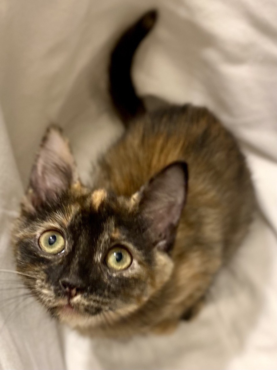 Энжи – маленькая героиня, которая спасла себя и своих родных! Это имя ей дано не зря! Несколько дней подряд её настойчивый писк доносился из-под обшивки фасада жилого многоэтажного дома, пока мы не разобрали её. И подарили свободу Энжи, её братику Марсику и сестренке Пэт. Сегодня её мяу – это уже не крик о помощи, а радостное приветствие. Энжи ждёт свою самую лучшую семью, чтобы подарить ей всю свою любовь. Что за сокровище наша Энжи? Это невероятная внешность, уникальная окраска и загадочный, с поволокой взгляд. Энжи – это моторчик, включает своё громкое мурлыкание буквально с первого прикосновения. Она нежный компаньон, обожает спать рядом с человеком, совсем домашняя. Яркий характер, она любопытная, игривая, смышлёная и очень человекоориентированная. Энжи полностью готова к переезду: обработана от паразитов, привита, сданы все анализы. С лотком, когтеточкой и сухим кормом для котят (предпочтение – Royal Canin) полный порядок. В новый дом может поехать одна или со своим братиком или