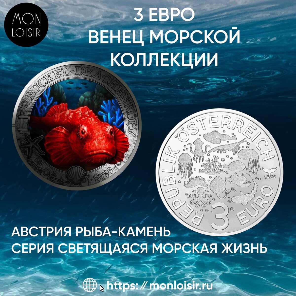 Внимание, коллекционеры! Финальный аккорд из бездны! 🌊 Австрия ставит эффектную точку в своей яркой нумизматической коллекции. В сентябре 2025 года серия 3-евровых монет Светящаяся морская жизнь завершилась выпуском 12-той монеты Рыба-камень. Глубоко в океанской тьме таится хищник, чье тело, покрытое буграми и шипами, — идеальная маскировка, превращающая его в часть морского дна. Scorpaenopsis diabolus — «дьявольский скорпенопсис» — мастер иллюзий, и это загадочное существо «оживает» на монете: в ультрафиолетовом свете его контур начинает таинственно светиться, раскрывая скрытую сущность охотника, который словно появляется из самой глубины металла. ⭐️Уникально! Все монеты серии объединяет особая технология: ручное нанесение светящейся краски на заготовку, что и придает каждой из них одинаково яркое и четкое свечение. Теперь, когда коллекция обрела свою финальную монету — таинственную Рыбу-камень, — мы готовы предложить вам всю серию монет 3 евро Светящаяся морская жизнь. Дополните