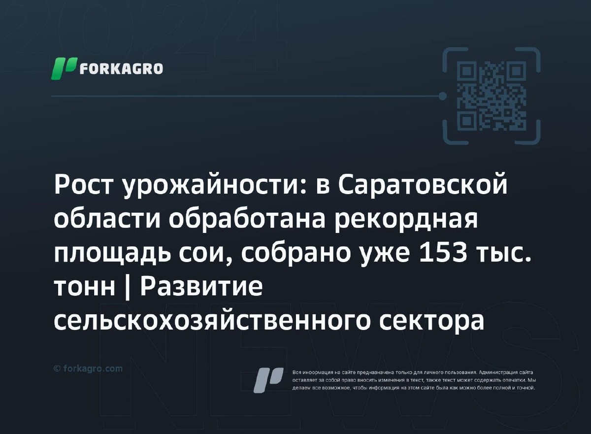 Рост урожайности: в Саратовской области обработана рекордная площадь сои, собрано уже 153 тыс. тонн | Развитие сельскохозяйственного сектора В Саратовской области увеличивается посевная площадь под соей, урожай превысил 153 тыс. тонн. Общий сбор урожая бьет исторический рекорд. Средний урожай вырос на треть. Регион увеличил посевы сои на 4% и занимает третье место в округе. Выращивание сои прибыльно и пользуется спросом. Развитие этой культуры поддерживается государством в области оросительного земледелия. Расширение посевов сои — перспективное направление для сельского хозяйства. Перейти к источнику