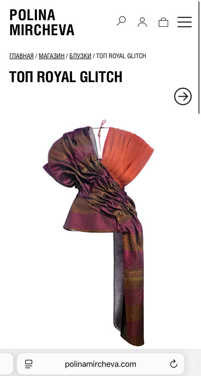 Комбинированный топ Royal Glitch с драпировками и складками, выполненными вручную. Смотрится просто фантастически в сочетании с уличным стилем - чем-то простым и базовым, чтобы ничего не затмевало его красоту. https://polinamircheva.com