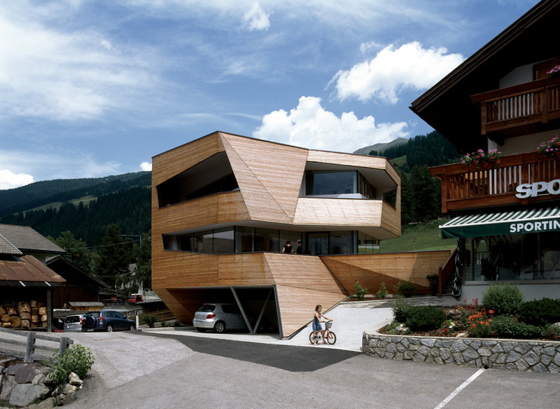 Этот дом, построенный в Альпах, на границе с Австрией, стоит на наклонном участке в достаточно плотной застройке, что, частично, определило его форму и функциональные решения. Весь дом буквально обтянут деревянной “кожей”, которая придаёт ему чёткую текстуру и фиксирует форму, образуя полузакрытые балконы-галереи, на первом этаже переходящие в просторную деревянную террасу, а на втором охватывающие полдома...