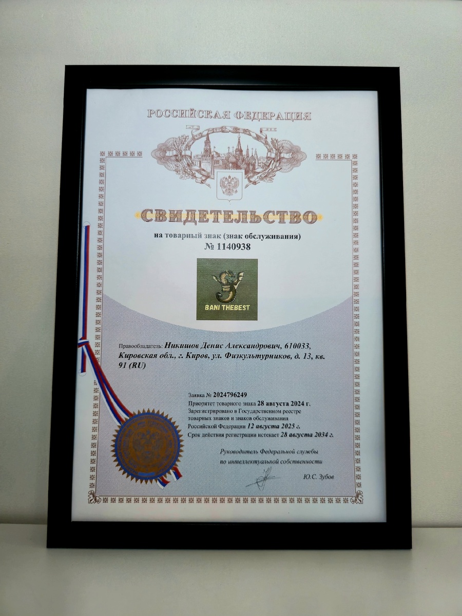 Наша компания зарегистрировала товарный знак BANI THЕВЕST в Роспатенте. Это подтверждает правовую защиту бренда, уникальность и надежность наших услуг. Сайт: banithebest.ru