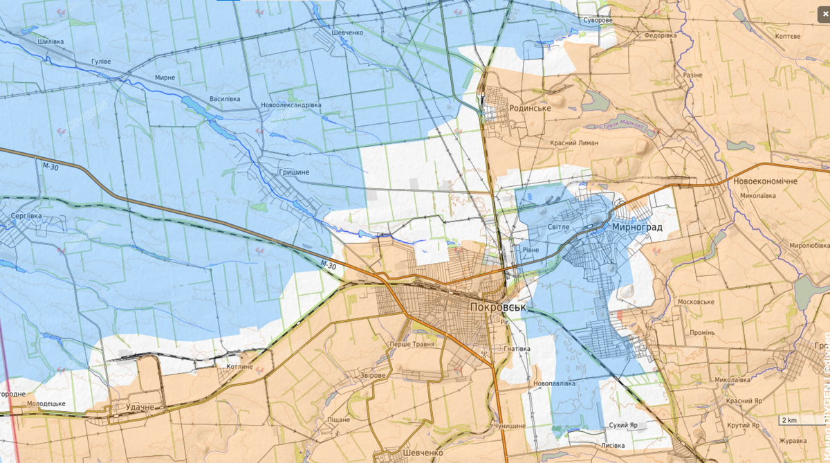 Покровско-Мирноградский УР как единое целое перестал существовать. Последняя надежда ГШ Хунты на успешный контрудар и занятие Родинского превратился в ловушку. Бои за ш/у севернее Удачного, равно как и по всему западному фасу Покровска – во вторую. В Ровном бои, на очереди Светлое. … ЮЗ Новопавловка. То самое большое село, бои за которое так и не начались даже после осв-ия нашими Муравки, Филии и Ивановки… … Бои на бывшем ЮД направлении более чем успешны. Именно здесь наши быстрее всего идут на запад. Полностью освобождена Успеновка, единая линия обороны пр-ка вдоль р. Янчур более не существует. Наши наступают от Успеновки на юг и от Полтавки на запад – бои за Новое и Новоуспеновское. Начались бои на восточных окраинах Даниловки. А это дорога … Много западнее, у Днепра, продолжаются бои за осв-ие Степногорска. Идти им еще не один месяц… Еще одна битва – за Купянский УР. Между нашими в городе и Колесниковкой южнее на восточном берегу – 15 км. Ключевая точка – станция Осиново. И, разумее
