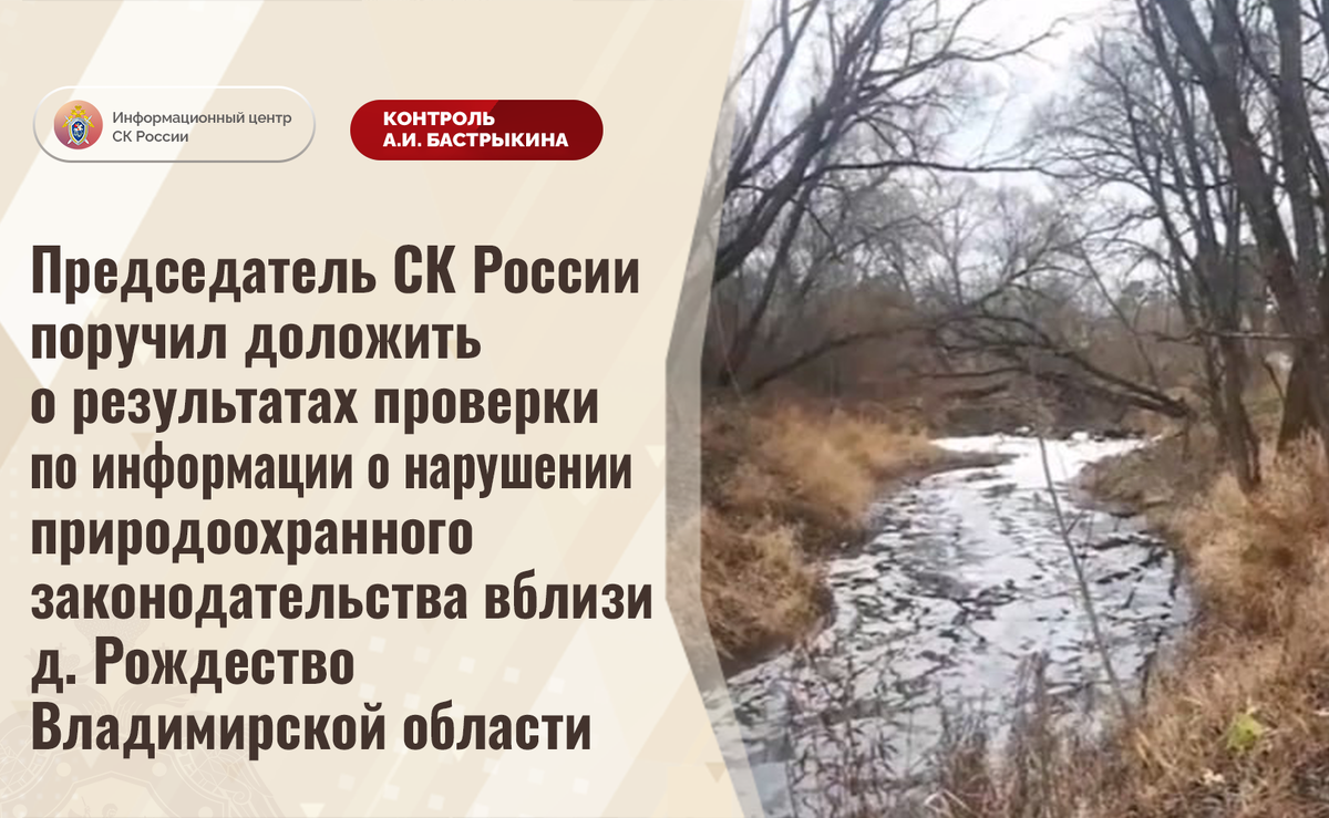 Председатель СК России поручил доложить о результатах проверки по информации о нарушении природоохранного законодательства вблизи д. Рождество Владимирской области В СМИ и социальной сети сообщается, что на протяжении нескольких лет одним из фермерских хозяйств вблизи деревни Рождество Владимирской области осуществляется полив полей с использованием биологических отходов, часть из которых попадает через лесной массив в реку Пекшу, что регулярно приводит к ее загрязнению и гибели фауны. Несмотря на наличие нарушений, компетентными органами мер реагирования не принимается. В СУ СК России по Владимирской области организована процессуальная проверка. Председатель Следственного комитета Российской Федерации Александр Иванович Бастрыкин поставил ход процессуальной проверки на контроль в центральном аппарате ведомства и поручил руководителю СУ СК России по Владимирской области Артему Александровичу Кулакову доложить о промежуточных результатах процессуальной проверки и принятом по итогам реше