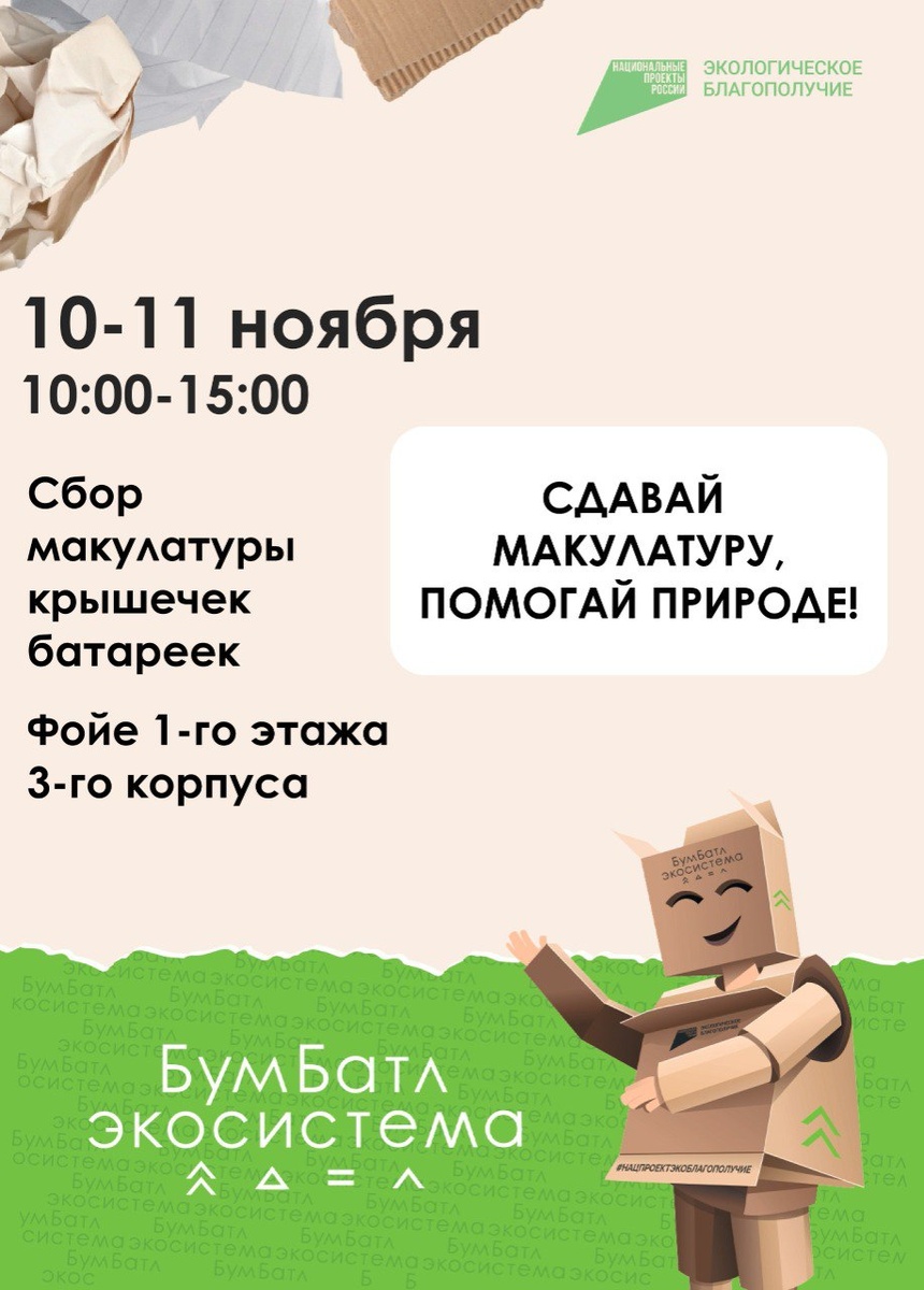 Сдавай макулатуру, помогай природе! 🌳 ОГУ присоединяется к масштабной акции по сбору макулатуры «Бумбатл», проводимой в поддержку национального проекта «Экологическое благополучие». 10 и 11 ноября на площадке вуза студенты и сотрудники смогут передать на переработку бумагу и картон, а также пластиковые крышки и отработанные батарейки. Наиболее активные индивидуальные участники и подразделения получат подарки от организаторов акции. Сбор будет осуществляться в фойе первого этажа третьего корпуса, а всё собранное вторсырье отправится на переработку на предприятия региона ♻ #ОГУ #в_ОГУ #OSU