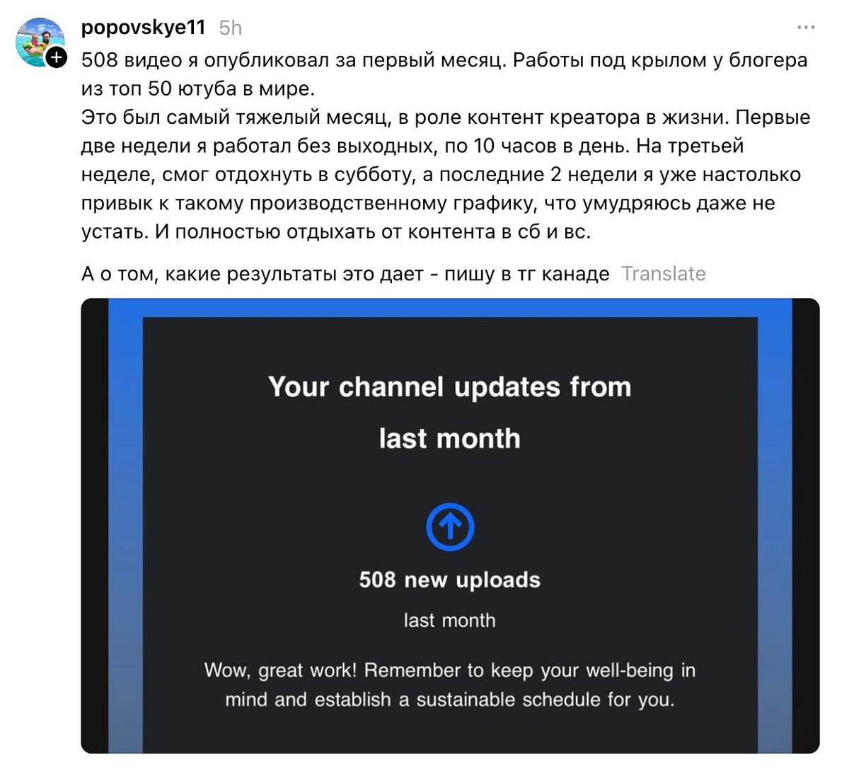 508 вертикальных видео за месяц... В развлекательной нише и в экспертном контенте это будет перебор, но например 10 в день – это то, к чему можно стремиться в производстве контента, если хочешь создать себе переизбыток трафика. Тут можно было бы начать продавать ИИ, контент-завод какой нибудь. Но давайте будем честными. Чтобы вы ни настроили, вам надо минимум 2 часа в день выделять на контент. Качать насмотренность, смотреть что происходит в нише, думать, что можно ещё снять, смотреть что зашло/не зашло и делать корректировки. И чтобы регулярно выпускать большие объёмы контента надо: - Снизить уровень перфекионизма в контенте. Выпускать готовые на троечку. - Собирать команду или как минимум подрядчиков – делегировать монтаж, публикацию, упаковку роликов. - Ну и внедрять ИИ на каждом этапе, который на 100% никогда не заменит и не автоматизирует, но высвободит ресурсы на совсем рутинные действия.