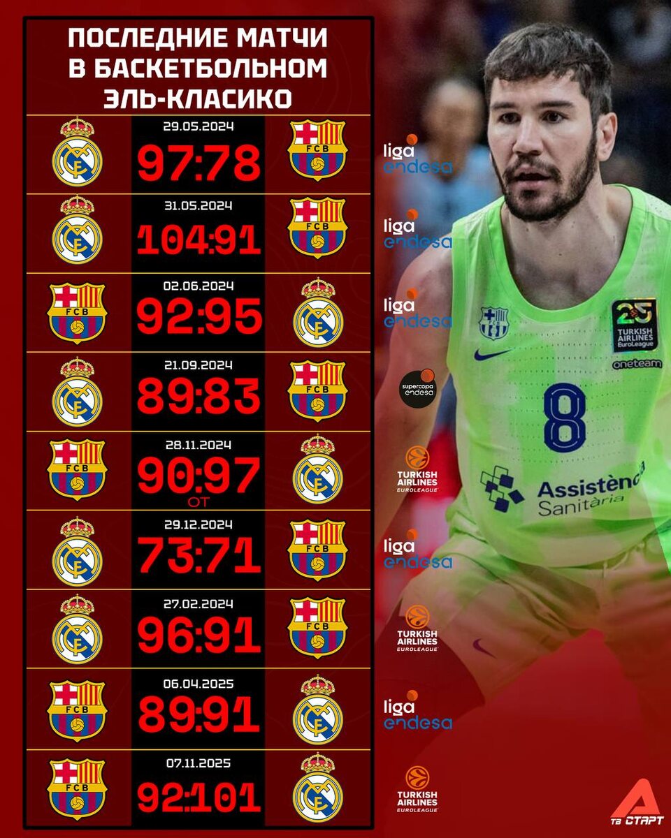 💀😱Это вам не футбол! «Барса» уступила в ДЕВЯТОМ баскетбольном Эль-Класико подряд «Реал» успешно съездил на матч Евролиги в гости к «сине-гранатовым» и нанёс им очередные поражение (101:92)👑 Лапорта, этой «Барсе» срочно нужен Ламин Ямаль из мира баскетбола😅 Подписывайся на ТВ СТАРТ в MAX📲