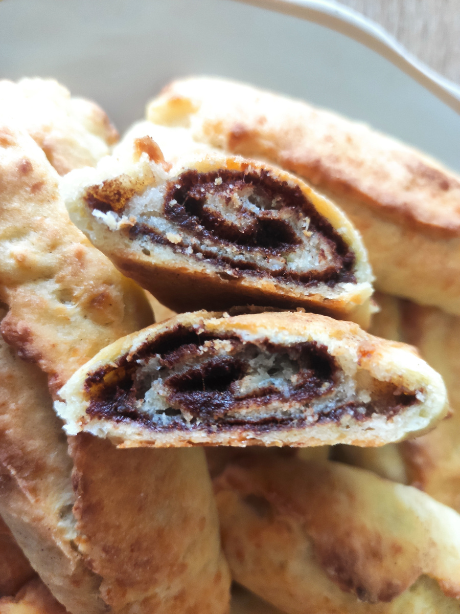 Если вы ещё помните "Плоскодончики" - название несладкого дрожжевого печенья, которое выдумал мой папа, то вот вам продолжение. Не знаю, чем он руководствовался, но творожные рулетики с корицей обрели новое и броское название - крюлетки! Нам понадобится: творог 250г, мука 200 г, 125 г сливочного масла, яйцо, разрыхлитель 4 г, сахар, корица. У меня было только 200г творога, поэтому и муки я взяла поменьше, 150г. По рецепту сахар в тесто не добавляется, но я добавила 4 чайные ложки. Смешать яйцо, творог, сливочное масло (размягчение), разрыхлитель и муку. Разрезать тесто, делением на двое на 16 кусочков, раскатать в лепешечку. На каждую реченьку насыпать чайную ложку смешанных корицу с сахаром, скатать рулетики, защипать края. Выпекать 20-25 минут в разогретой духовке, при 180 градусах.