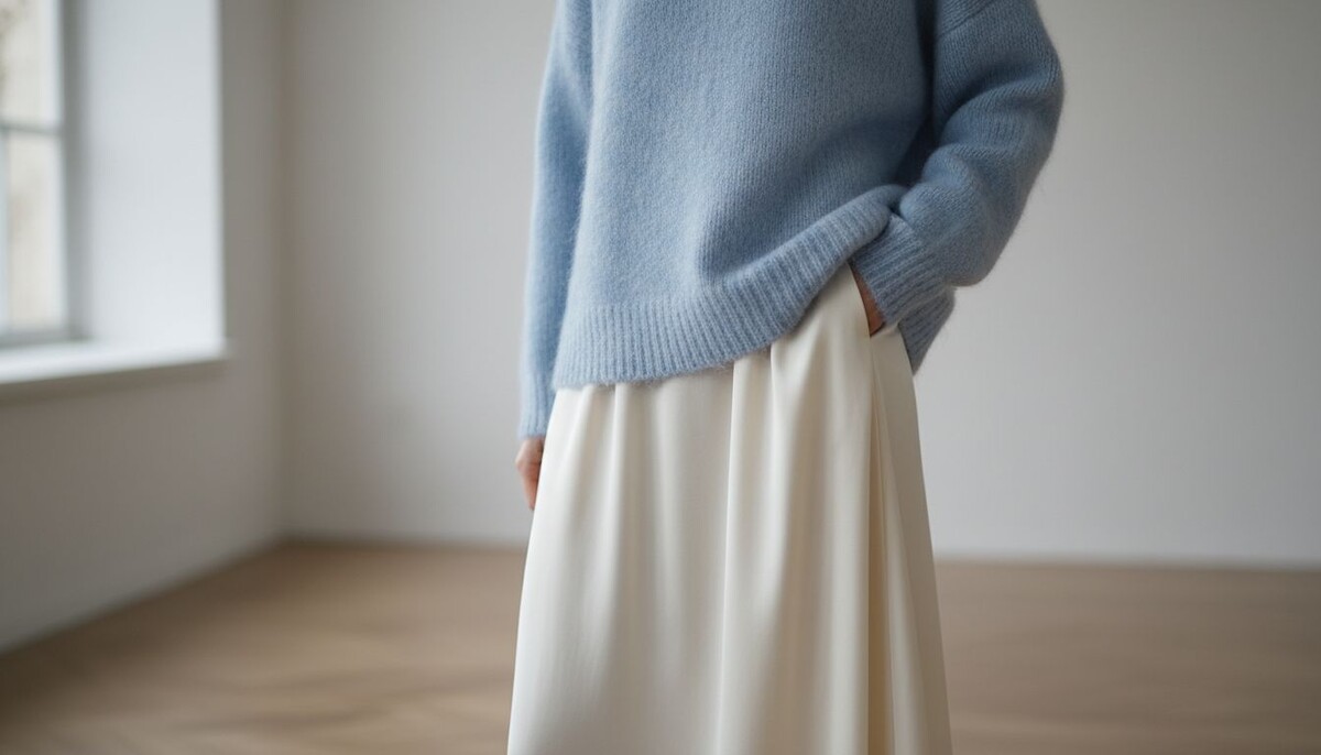 - Сместите акцент вниз: Выберите голубые брюки или юбку-макси, а у лица оставьте теплый нейтрал (например, молочно-белую водолазку или топ).