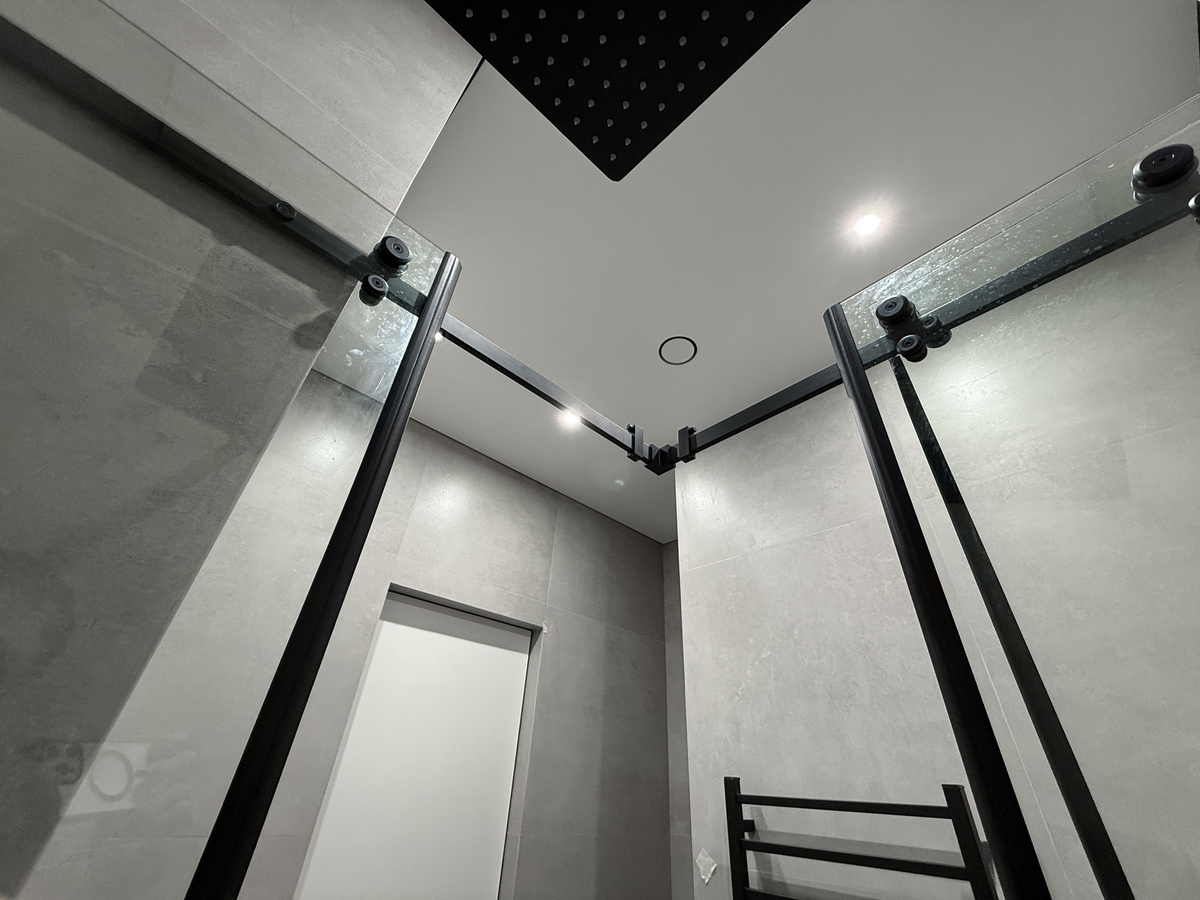 Здесь выполнена полная коллекторная разводка, установлена система защиты от протечек и редукторы давления. Вода подаётся через фильтры 100 мкм, все соединения скрыты за люком-невидимкой. Душевая зона собрана в строительном исполнении: трап с разуклонкой, двойная гидроизоляция, стеновые и напольные швы затёрты эпоксидным составом. Стоит встраиваемый душевой комплект Boheme Qubic в матовом чёрном, гигиенический душ того же бренда и стеклянная перегородка. Плитка 800×800 мм даёт монолитный вид, а ниша из керамогранита с подсветкой добавляет объёма и тепла.