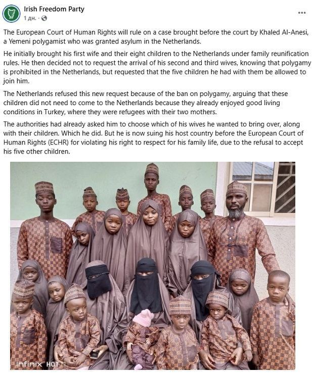 Мигрант из Йемена подал в Европейский суд по правам человека на Нидерланды за то, что ему не позволили воссоединиться с родными детьми. Ну, по порядку. Чувак – многоженец. У него три жены и хренова туча детей. Вот однажды он подал на убежище в Нидерландах и ему его предоставили. А спустя какое-то время говорит, что у него есть еще три жены и хренова туча детей. И ему позарез надо организовать их переезд по программе воссоединения семей. Голландцы ответили, что многоженство в Европе не приветствуется, поэтому они готовы принять только одну жену по его выбору. Чувак выбрал жену (самую красивую) и 8 детей. А спустя время пожелал пригласить еще 5 детей, которые от других жен. Ему отказали, потому что, говорят, мы в многоженство не верим, эти дети родились от жен, в которых мы не верим, поэтому их как бы и нет вовсе. И вот тогда йеменец подал на Нидерланды в суд. Говорит, ему нельзя отказывать в праве жить с родными детьми. Я не удивлюсь, если ЕСПЧ иск удовлетворит и заставит терпил из Ни