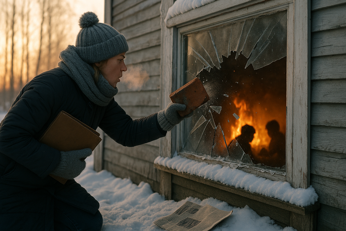 Анна сняла варежки, бросила в сугроб, подтянулась и нырнула внутрь. Воздух был тяжёлым и горьким, слёзы выступили моментально. Пол — горячий местами, под ногами хрустела разбитая посуда. Дым мгновенно пропитал пальто; стало тяжело дышать.