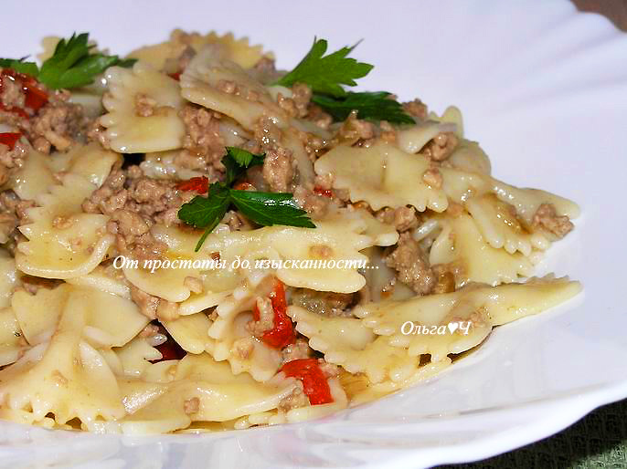 зелень для подачи Приготовление: На растительном масле обжарьте нарезанный лук и сладкий перец. Добавьте фарш, обжарите, помешивая, до изменения цвета. Влейте вино, дайте выпариться спирту, щедро посолите и поперчите. Тушите около 20 минут. Тем временем отварите пасту, затем смешайте её с приготовленным фаршем. Разложите блюдо по тарелкам, украсьте зеленью и подавайте. Приятного аппетита! Вам также могут понравиться: