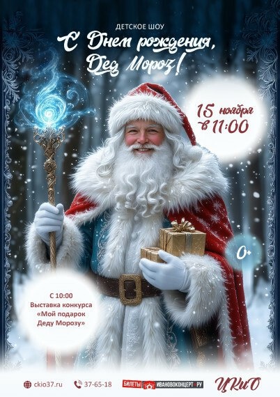 Ивановцев приглашают отметить день рождения Деда Мороза 15 ноября в Центре культуры и отдыха города Иванова пройдет сказочное шоу «С Днём рождения, Дед Мороз!» (0+). В честь зимнего волшебника выступят театр спорта «Дебют», вокально-эстрадная студия «А+Б», грузинский ансамбль народного танца «Иберия» и другие артисты города. Каждый участник программы приготовил яркий концертный номер.Организаторы шоу обещают много весёлых интерактивов для каждого. С 10 утра будет открыта выставка работ участников конкурса «Мой подарок Деду Морозу», на ней представят самые интересные рисунки и поделки, созданные руками детей специально к дню рождения Дедушки Мороза. Начало представления в 11:00. Справки по телефону: 37-65-18.
