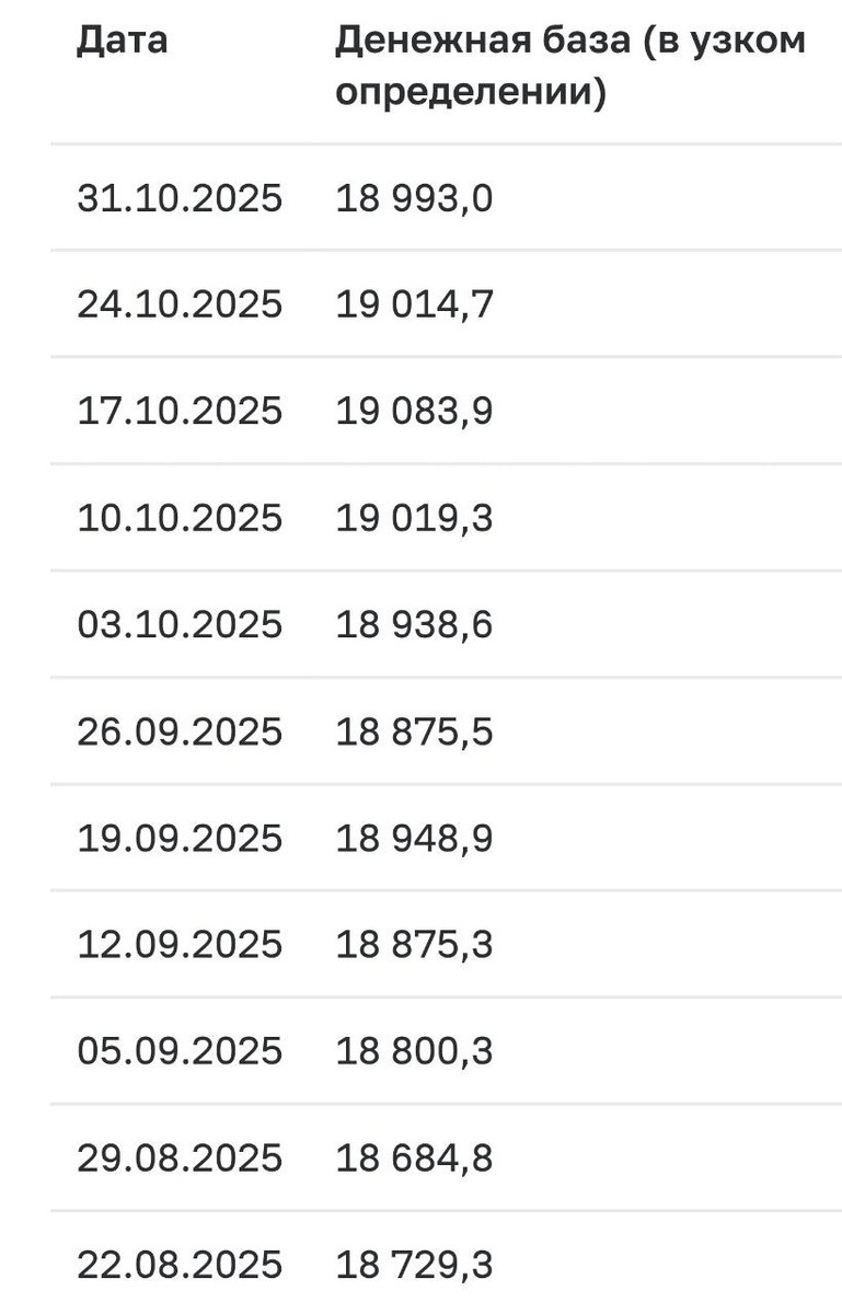 Наличные: больше не становится Конечно, важнее агрегат М1 (нал. + средства на расчетных и накопительных счетах, т.е. деньги которые можно моментально испол зовать). Но М1 ЦБ публикует ежемесячно, данных на 1 ноября8 пока нет. Вывод ЦБ продолжает жесткую денежно-кредитную политику. Это негатив для фондового рынка. Фактически, денег (с учетом инфляции) становится меньше Ситуация, когда кредиты растут (прошлый пост), а наличные деньги у населения — нет, является тревожным сигналом. Она свидетельствует о том, что рост кредитования не приводит к росту финансового благосостояния граждан, а лишь поддерживает текущий уровень потребления в условиях высокой долговой нагрузки и инфляции.
