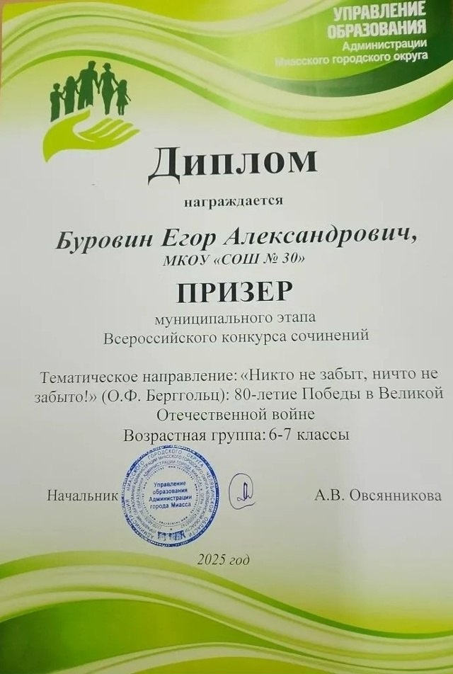 Подведены итоги муниципального этапа Всероссийского конкурса сочинений 2025 г. Буровин Егор, ученик 6К класса, стал призером сочинения по тематическому направлению "Никто не забыт, ничто не забыто!" (О.Ф. Бергольц) : 80-летие Победы в Великой Отечественной войне. Поздравляем Егора с достойным результатом! #30школа ----- Сообщает: МКОУ "СОШ №30" официальное сообщество г.Миасс 🫛Миасс Православный