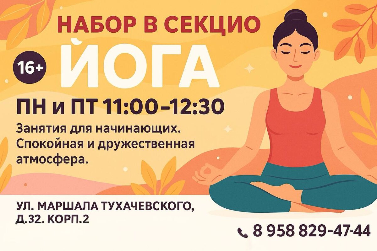 🧘♀️ Набор в секцию ЙОГА 🧘♂️ Хотите стать более гибкими, спокойными и энергичными? Занятия йогой помогут улучшить осанку, укрепить мышцы, развить дыхание и найти внутренний баланс. 🌿 Приглашаем всех желающих от 16 лет на уютные и доступные тренировки под руководством опытного инструктора. Каждое занятие включает мягкую растяжку, дыхательные практики и расслабление под спокойную музыку. 📅 Расписание: 🕚 Понедельник и пятница — 11:00–12:30 📍 Адрес: ул. Маршала Тухачевского, д.32, корп.2 📞 Запись по телефону: 8 (958) 829-47-44 8 (495) 495-91-10 🔖 Код для записи на mos.ru — 918748 ✨ Присоединяйтесь, чтобы начать свой путь к гармонии тела и души! #йога #йогадлявсех #йогаМосква #здоровье #гибкость #растяжка #релакс #осознанность #спортдлявсех #йогастудия #Тухачевского #окцсзао 📱 Подписывайся на наш канал, чтобы не пропустить интересные мероприятия и мастер-классы в СЗАО!