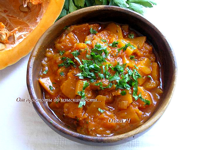 соль, перец по вкусу Приготовление: Лук и чеснок мелко нарежьте, обжарьте на растительном масле до прозрачности, присолите. Добавьте нарезанную тыкву, обжарьте 5 минут, помешивая. Влейте томат с соевым соусом, перемешайте, доведите до кипения. Тушите 10 минут. Всыпьте базилик, посолите, поперчите. Тушите до мягкости тыквы. Подавайте с зеленью. Приятного аппетита! Вам также могут понравиться: