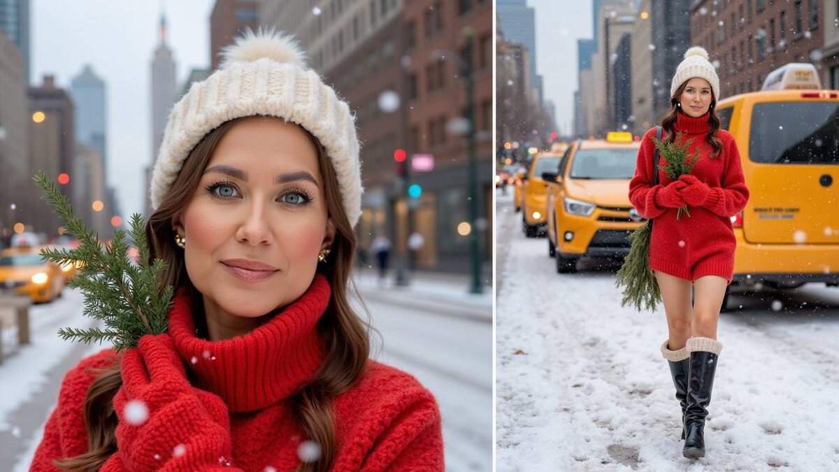 Новогоднюю фотосессию хотите?) Все же как чудесно, что можно сделать любые фото нажатием одной кнопки) причем очень реалистичные и достаточно смелые, вряд ли я бы вышла с голыми ногами в снег на фотосессию) Фон можно поменять на Красную площадь, например) Сохраняйте промт: Fashion editorial photo of the model in winter photoshoot, wearing red knit sweater and shorts, white faux-fur hat, mittens, over-knee socks, chunky boots, holding fir branches. Surrounded by falling snow, Moscow Red Square in background. Cinematic glossy Vogue-style lighting, ultra-detailed 8K, hyperrealistic textures, preserved facial identity, realistic skin pores, natural hair strands, snow motion blur. Poses: close-up hugging fir branch, full-body in snow, mid-step, calm relaxed portrait with subtle closed-mouth smile. Cohesive tone and lighting, bright overcast combined with soft studio light, clean white borders, no text or grids. Style: high-fashion, holiday, cinematic, glossy, festive, hyperrealistic, ed