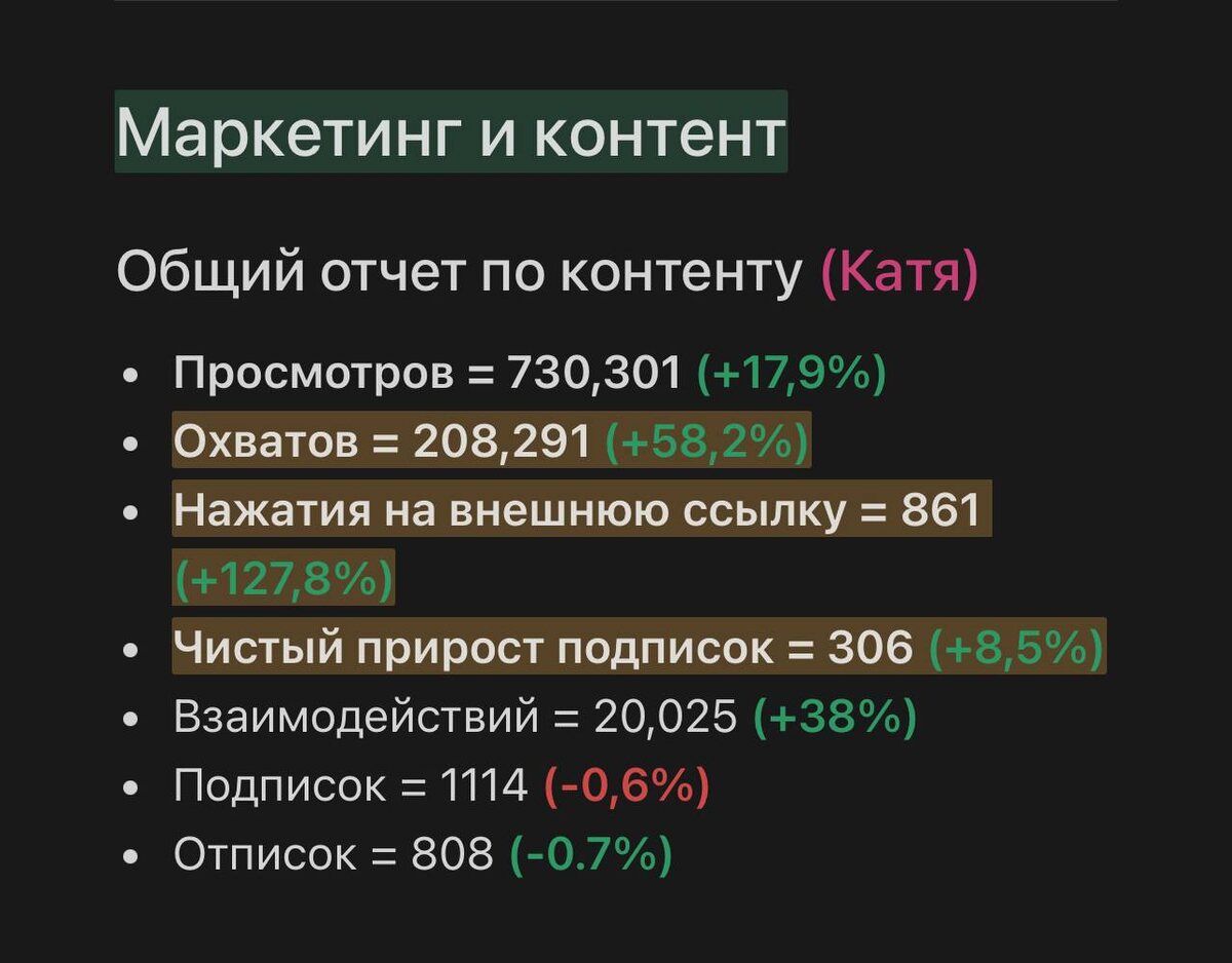 🐚 Отчет по маркетингу в запрещенной соц сети - октябрь (версия маркетолога агентства) На тему продвижения и ведения соц сетей всегда большой отклик, на любых выступлениях всегда говорим в итоге об этом)) к сожалению, у многих экспертов есть клиенты - нет времени на соц сети, есть время - нет ничего в работе Так не сработает, сила - в регулярности. У вас должно быть в расписании время и для соц сетей, простите за банальности. Не хотите снимать видео - напишите пост на своей самой удобной площадке, сделайте заметку в тредсе Я уже делилась своим подходом, который не отнимает кучу времени и не уводит меня в выгорание от постоянного поиска вдохновения: - 2 часа на работу с текстом в таблице excel 1 раз в неделю для запланированного контента (инст, ТГ) - 1 час на то, чтобы снять материал (в другой день) - есть идея - закидываю в канал идей - есть отзыв - закидываю в канал с отзывами, чтобы описать кейс - тредс веду ситуативно, несколько постов в день и там отличные охваты (на слайде) Д