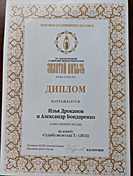 Книга "Судьба нелегала Т." отмечена дипломом МСЛФ "Золотой Витязь". Подписал Народный артист России, Президент форума Бурляев Н.П. Ваш BV.