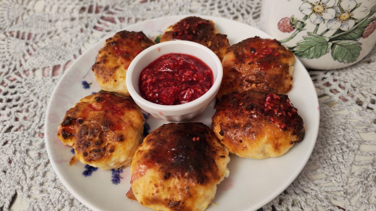 Сырники или творожники с яблоком подала к столу с протертой малиной