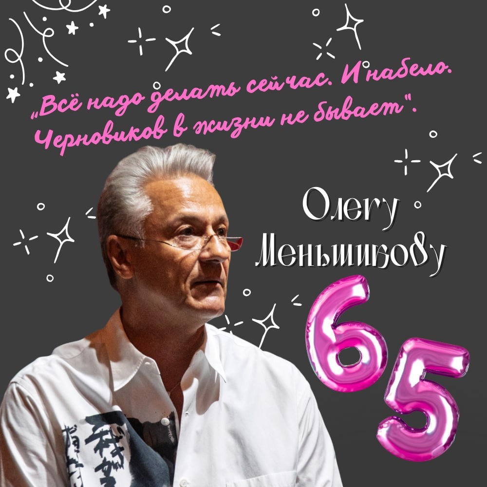 «Наверное, прозвучит не торжественно, но актёр — это профессия. Это мой способ познания себя и мира» Сегодня свой 65-летний юбилей празднует народный артист РФ, единственный российский артист — обладатель премии Лоренса Оливье, художественный руководитель театра Ермоловой — Олег Евгеньевич Меньшиков. Актёрское образование он получил в театральном институте имени М. С. Щепкина. Уже на четвёртом курсе дебютировал в главной роли в военной кинодраме «Жду и надеюсь» (1980). Стал любимцем публики после роли обаятельного аспиранта-историка Костика в лирической комедии Михаила Козакова «Покровские ворота» (1982). Позже сыграл в оскароносном фильме Никиты Михалкова «Утомлённые солнцем» (1994), в номинировавшемся на «Оскар» и «Золотой глобус» «Кавказском пленнике» Сергея Бодрова-старшего (1996). На сегодняшний день в фильмографии Олега Меньшикова более тридцати картин, а в числе ролей — капитан Фракасс, Юрий Живаго, Остап Бендер и другие. В 1980 году Олег Меньшиков поступил в Малый театр, зат