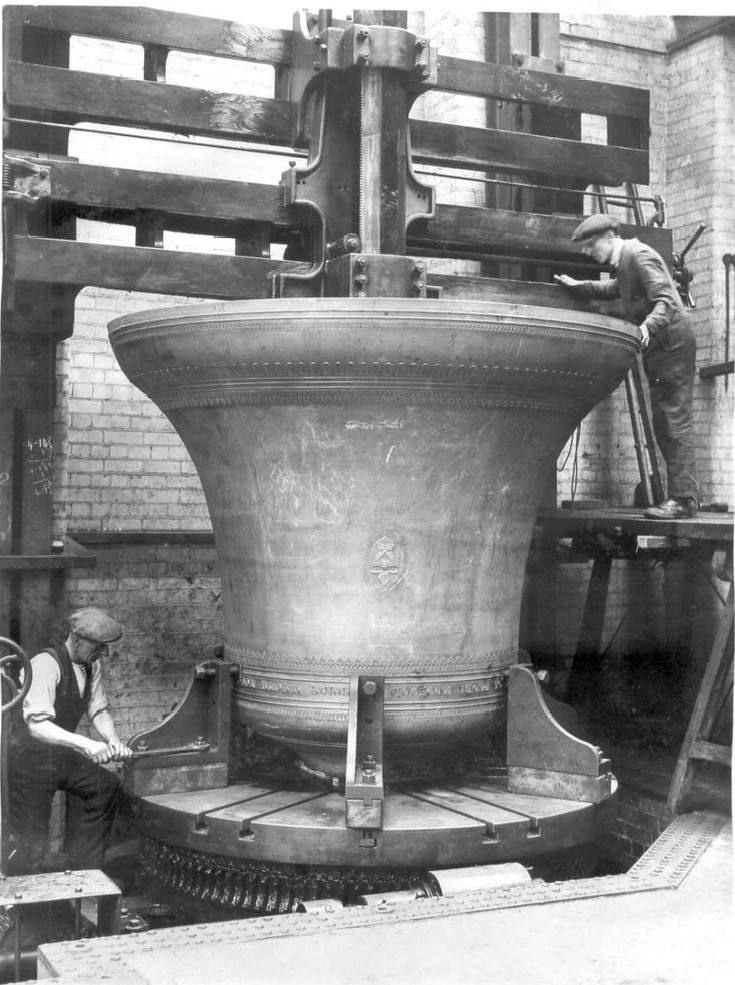 Когда-то обработка крупных изделий выглядела именно так: ручная установка, механическая подача, неделями идущая доводка. Перед нами — «прадед» современного токарно-карусельного станка: тот же принцип — массивная деталь фиксируется на поворотном столе и обрабатывается по окружности. Сегодня этот процесс уже ушёл в эпоху цифры. Современные машины — такие, какие мы используем сейчас — работают с ЧПУ, обеспечивают стабильную геометрию, автоматическую подачу и многократно более высокую скорость. Время обработки сократилось с недель до часов, а качество стало повторяемым. Колокола мы уже не точим — но технологическая преемственность видна без слов.